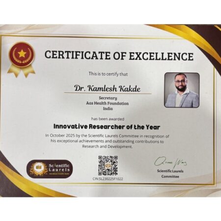 Awarded to Dr. Kamlesh Kakde in recognition of his unwavering scientific temperament, innovative research orientation, and tireless efforts to advance evidence-informed homeopathy, this honour highlights his pioneering contributions, particularly in the management of neurological and chronic diseases. It reflects his commitment to strengthening credibility through systematic research and clinical documentation.